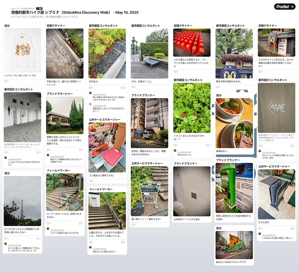 今回は、女性2名、男性2名の少人数での実施。参加者それぞれが、配布されたロールプレイカードを手に、Padletへの投稿を通じて“いつもの風景”に対する新しい視点をシェアしながら、千駄ヶ谷から青山、六本木、広尾へと都心の森をつなぐように歩きました。