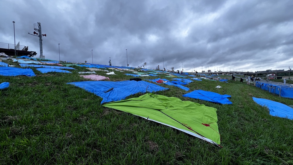 とりあえず花火大会に大量のポールやらテントやらビニールシートがあるので回収。