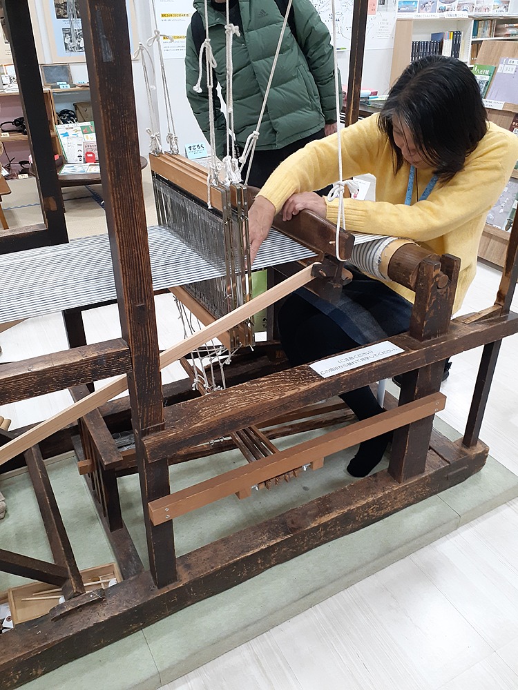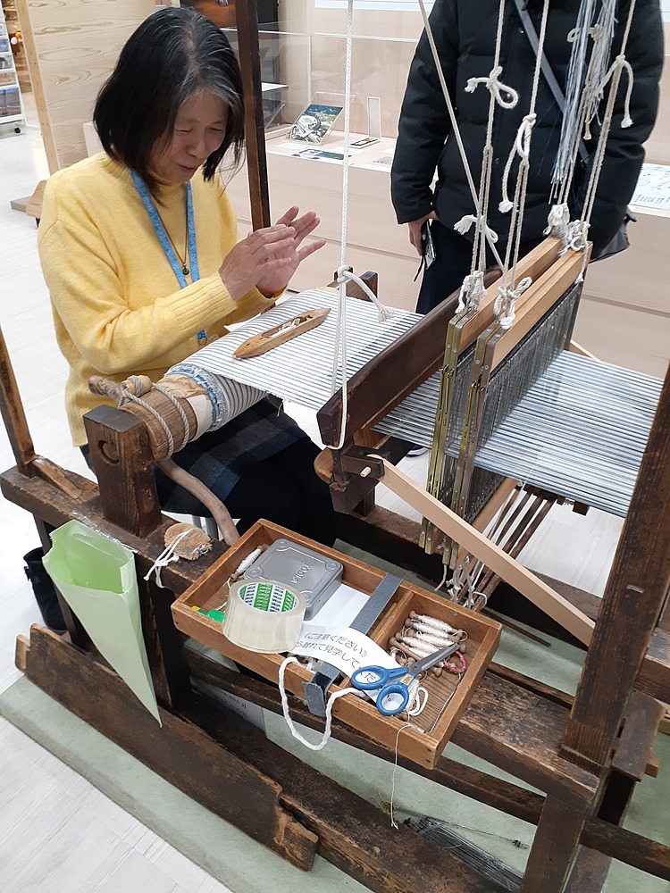 ①ー2 八王子は織物の街という歴史があります。画像にあるように、織物を職員さんが模擬で見せてくれました。映像などでは見ることはできるでしょうが、リアルを見るのは楽しいものです