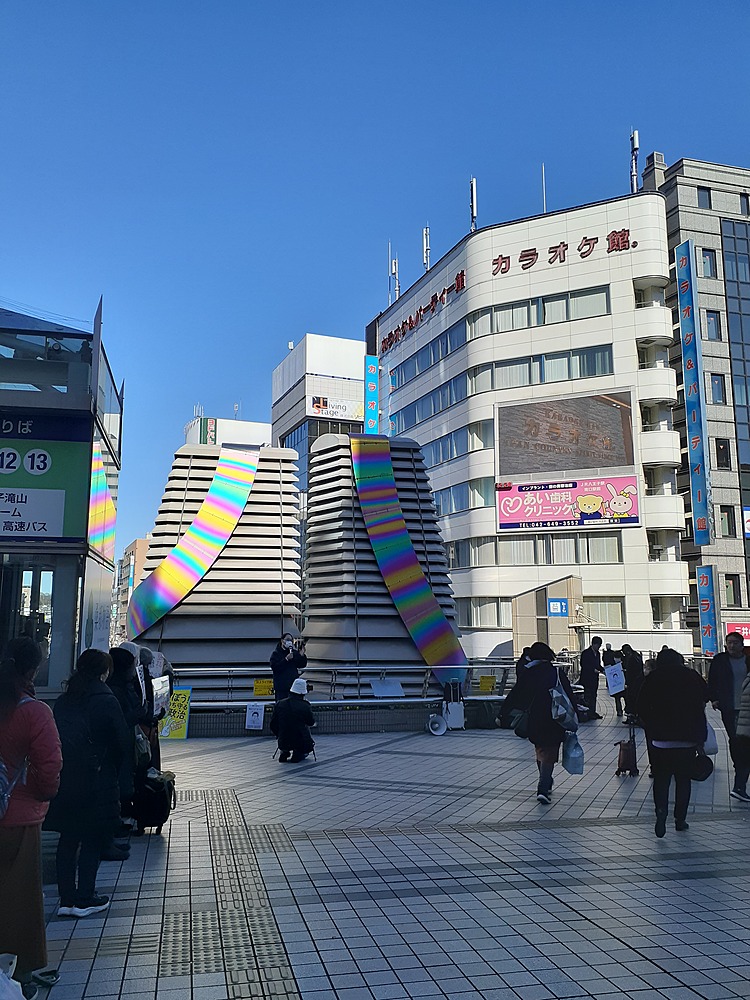 ②八王子駅北口の絹モニュメント(織物の街、八王子はかつて織物タワーというものがありましたが、今はこのモニュメントがその遺構となっています。近づきたかったのですが、演説のようなものをやっていて、遠目で見学)