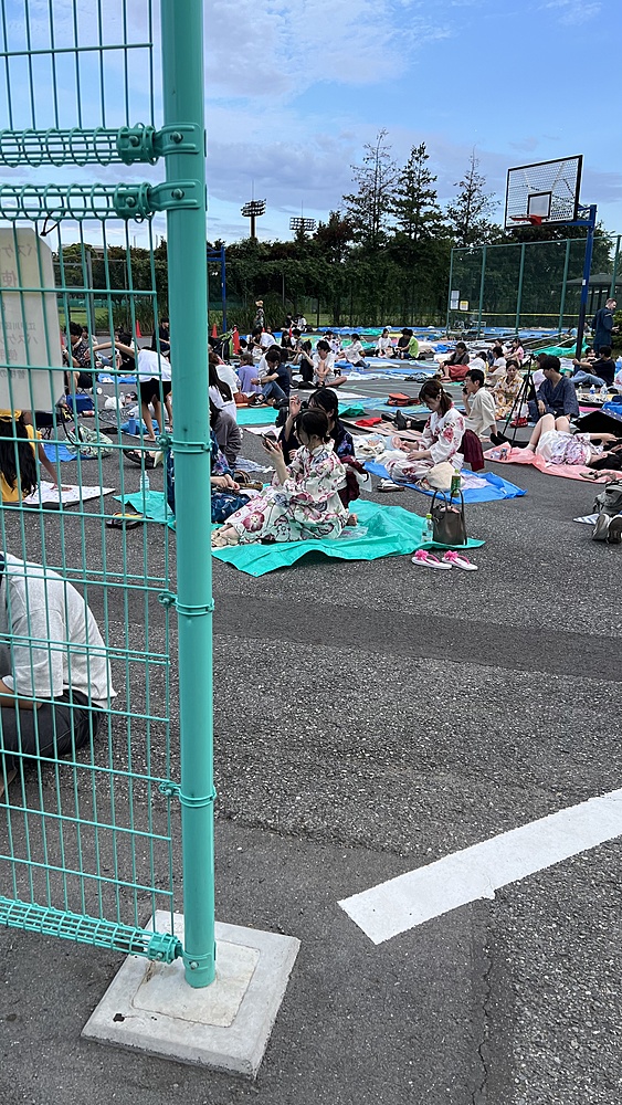 歩いて2分集合場所のバスケットコートに大量の人が。ビニールシートを引いている・・。