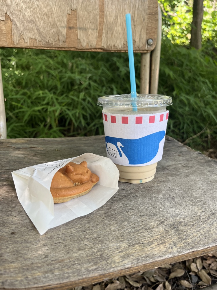 ブルースカイコーヒーというかわいいカフェでアイスラテと手作りねこドーナツを買って近くの丸太に座って一息。