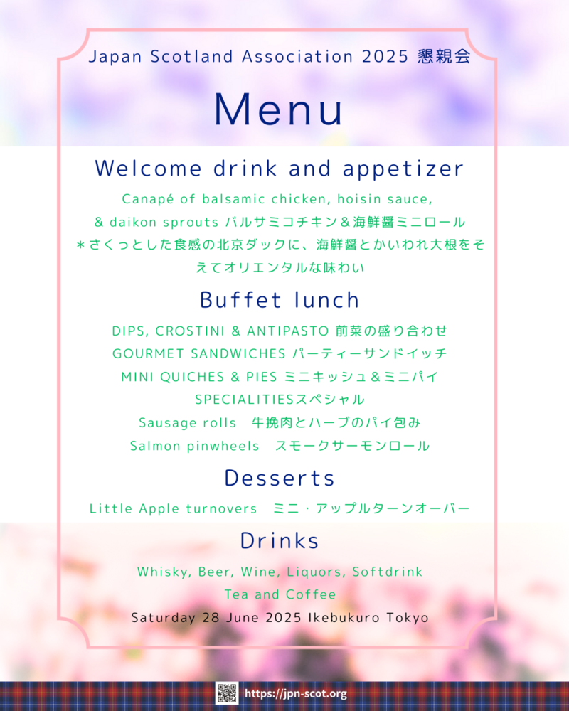 英国スコットランド文化満載の日本スコットランド交流協会(JSA)の懇親会が6月28日(土)、池袋のイベント会場で昼13時スタート!