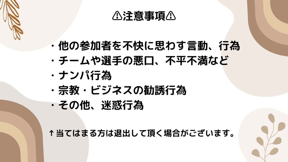 イベントの雰囲気を壊す行動をする方や、運営の指示に従わない方は、参加をお断りする場合があります。