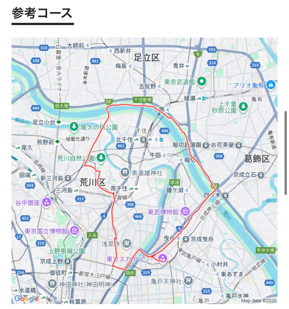 都内を代表する河川敷である荒川を通り東京の観光名所を堪能するコースです。