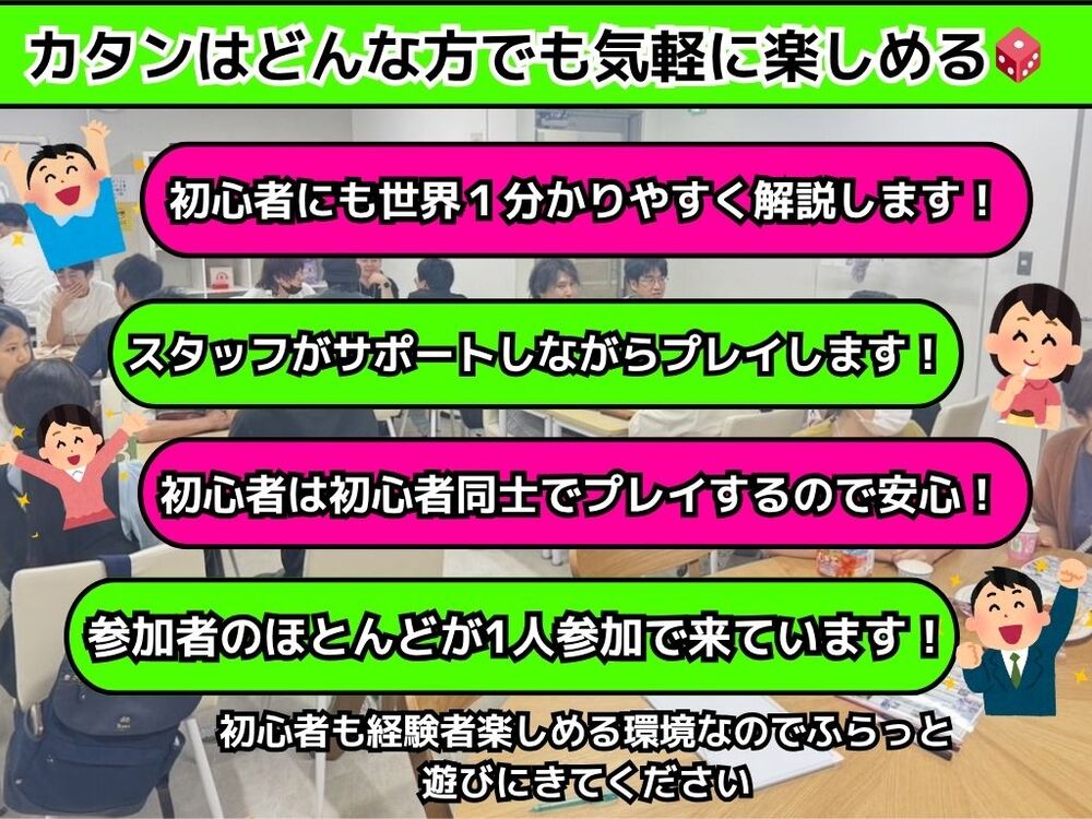 カタンってどんなボードゲームか気になるけど中々プレイする機会がない、カタンだけじっくり遊びたい!そんな方におすすめイベントになっています。