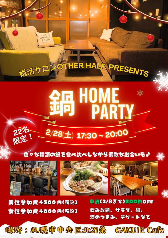 熱々のお鍋を囲んで、お酒や食事を楽しみながら自由に交流しましょう!席替えタイムもあります。