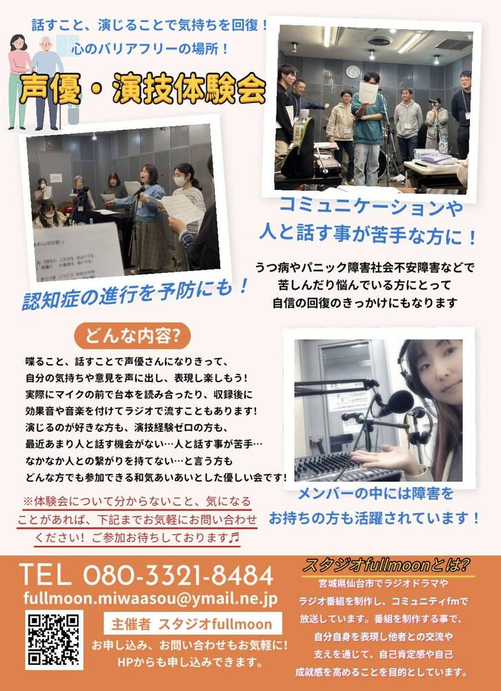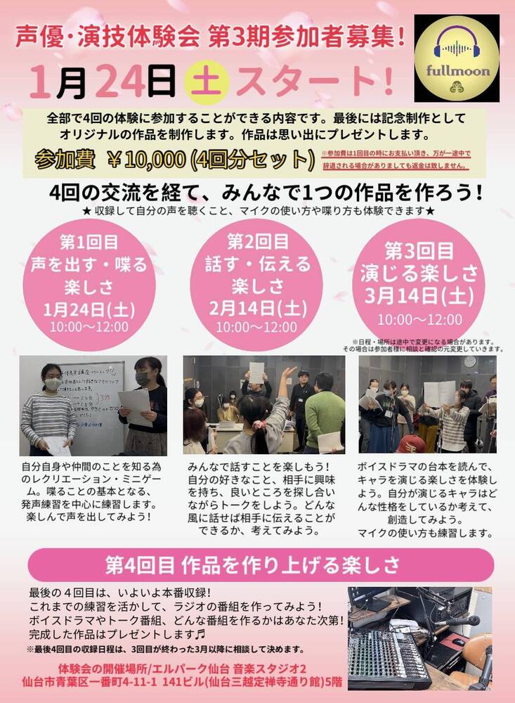 スタジオfullmoon主催の声優演技体験会です。今回は第3期開催分(令和8年1月~)の募集となります。