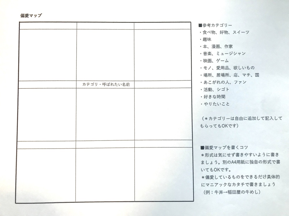 偏愛マップとは、自分が特に好きなことや興味を持っていることを視覚的に整理するツールです。