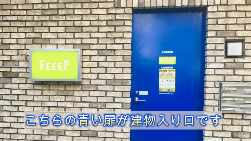 左手4軒目に見えるビルとなります。青いドアからお入りください。