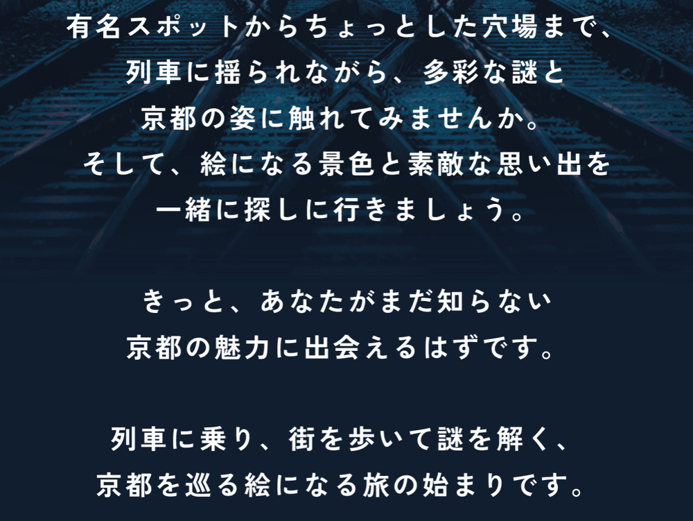 有名スポットからちょっとした穴場まで、 列車に揺られながら、多彩な謎と京都の姿に触れてみませんか。