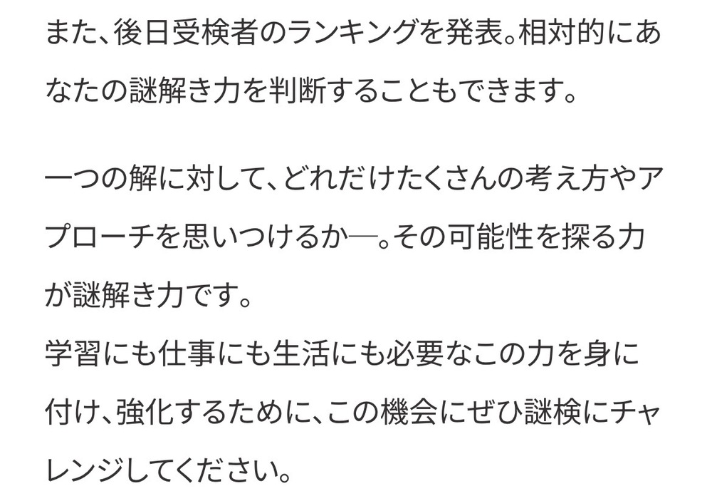 謎解き能力検定(略称:謎検)は、株式会社SCRAPが主催する、「謎解き力」を測るための検定です💡