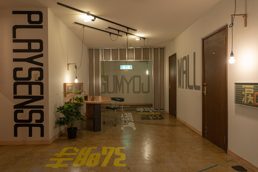 この物件の中には、佐藤修悦さんがガムテープで作り出した書体「修悦体」が空間の随所に散りばめられ、デザインされています。