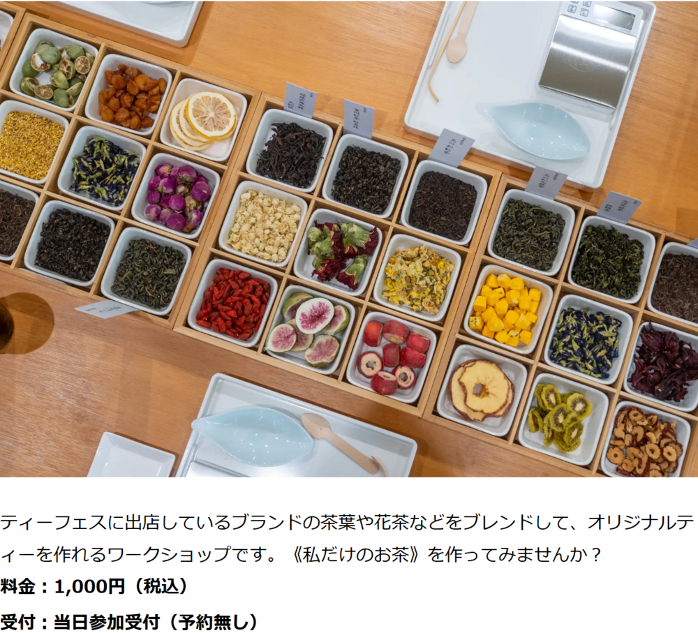 各店舗で試飲やオリジナルティーをつくれるワークショップなどもあります。また、生産者さんや店主さんのお茶への熱い想いを聞くチャンスです!