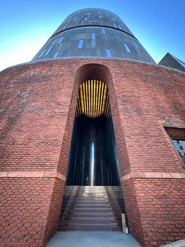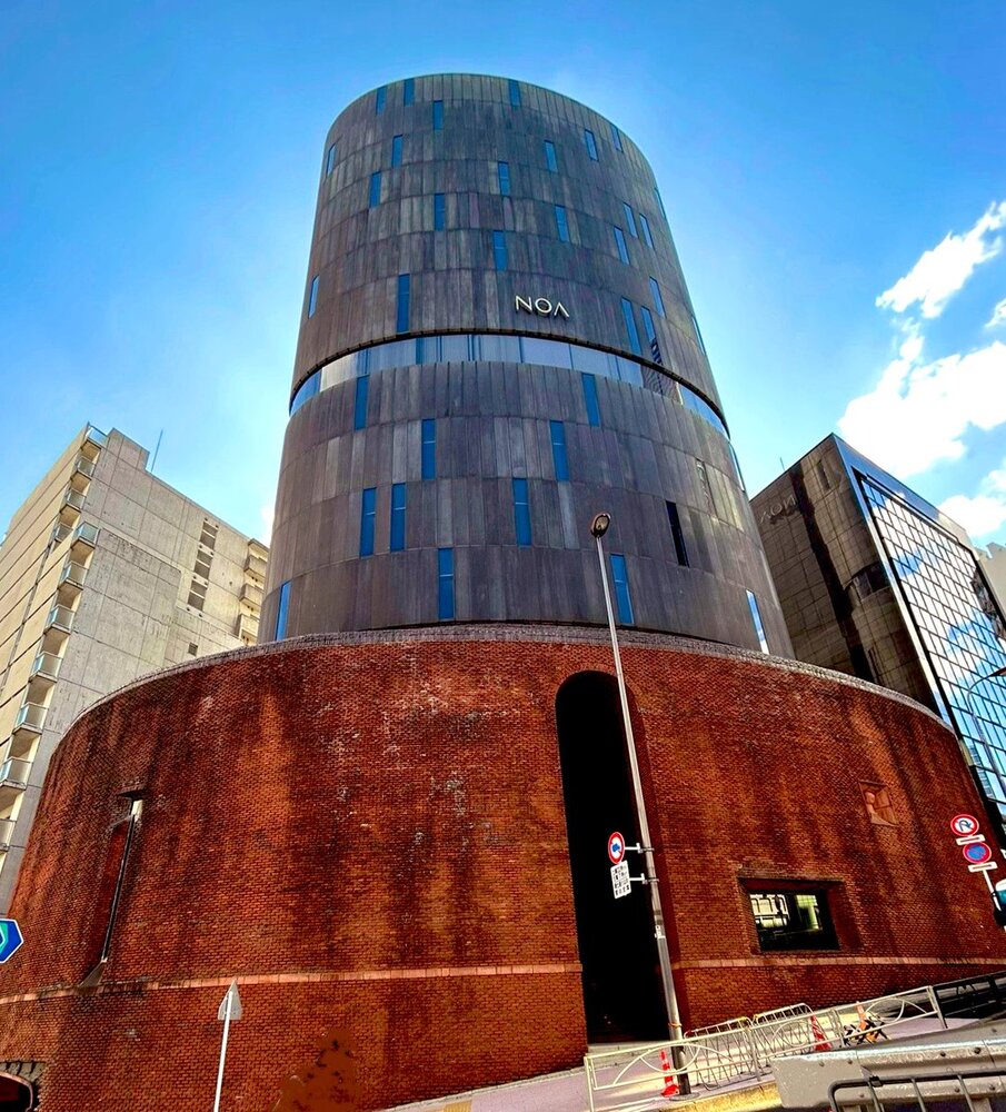 麻布台・飯倉交差点のランドマーク、ノアビルディングは、哲学的建築家と称される白井晟一の作品です。割肌レンガの基壇と硫酸銅仕上げの楕円筒形の塔が、都市に彫刻のような緊張感をもたらします。