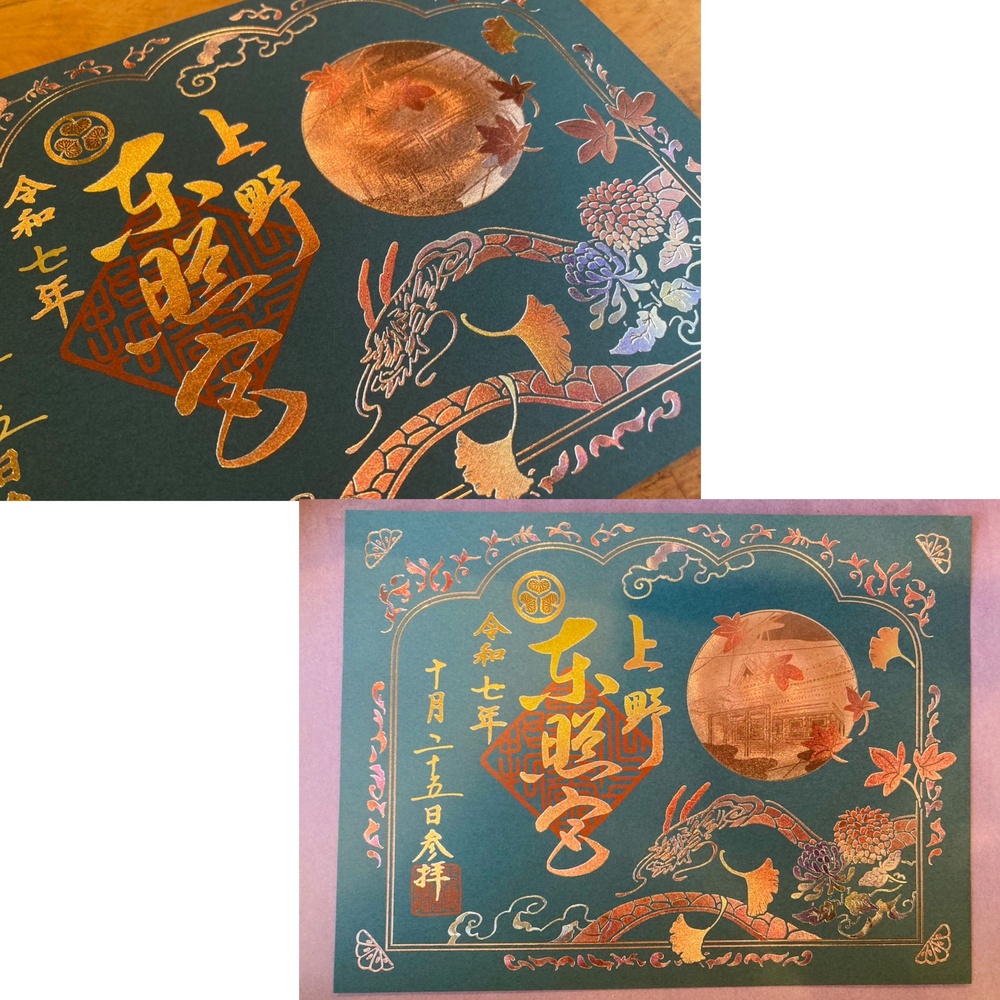 ☆御朱印 濃緑の紙に箔を押していて箔の凹凸で角度によって社殿が浮かび上がる仕様になってるそうです!キラキラ美しい御朱印です(1300円)