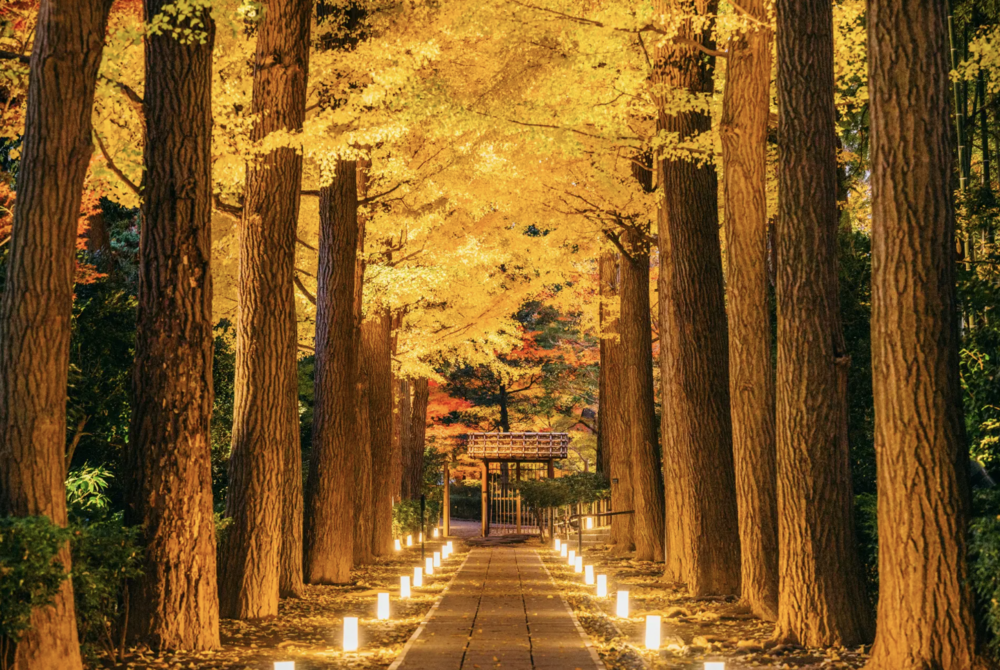画像掲載の大イチョウ27本が作り出す並木道が、秋には一斉に黄色に染まる景色は圧巻です✨特に紅葉の時期の夜間ライトアップは、特別な雰囲気を感じられます🍁