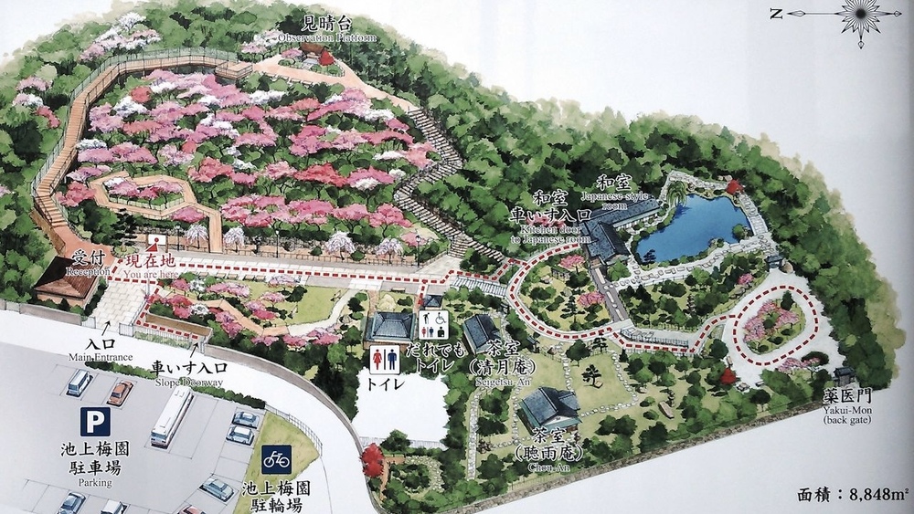 池上梅園では紅白の梅が咲き誇る美しい庭園を散策できます。