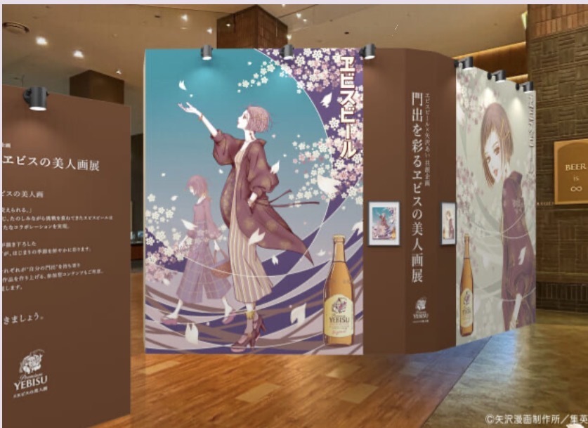 漫画家の矢沢あい氏が特別に書き下ろした美人画や、ヱビスビールと矢沢あい氏がコラボした特別デザイン缶が展示されています。