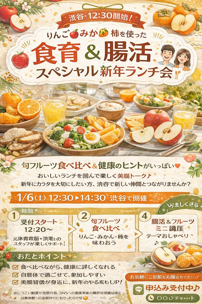 2026年1月12日(日)、渋谷駅近くのレンタルキッチンスペースにて12:30から開催🍊 りんご・みかん・柿をふんだんに使ったヘルシーランチで美腸&食育トークを楽しもう!