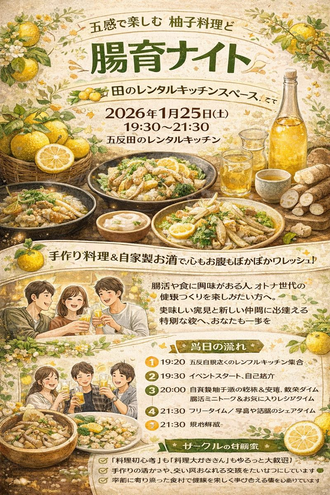 2026年1月25日(土)19:30~21:30、五反田のレンタルキッチンスペースにて、柚子をテーマにした手作り料理と自家製お酒が楽しめる、20代〜30代限定