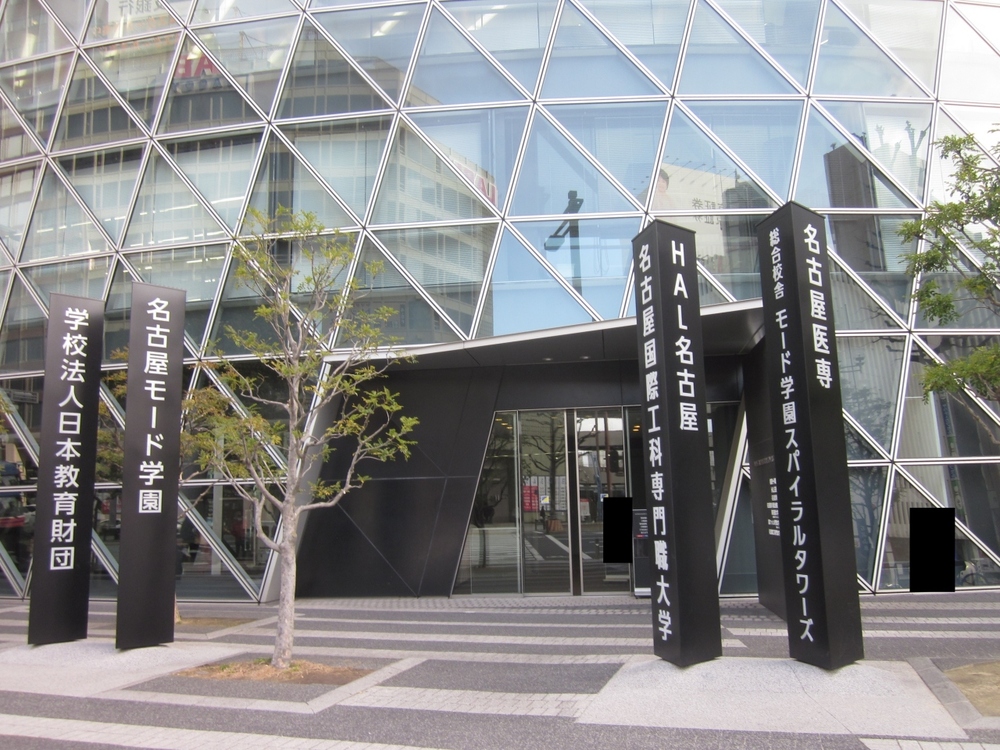 名古屋モード学園の建物の入り口付近に「名古屋モード学園」「学校法人日本教育財団」などと書かれた