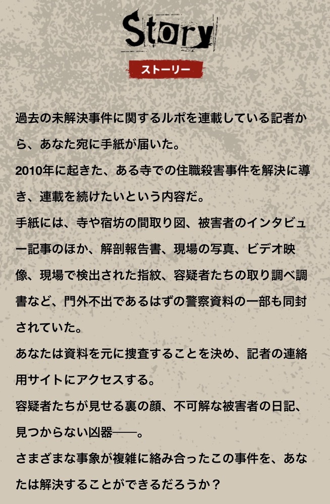 ・内容:大量の捜査資料をもとに、みんなで犯罪捜査🕵️🔍