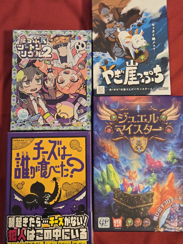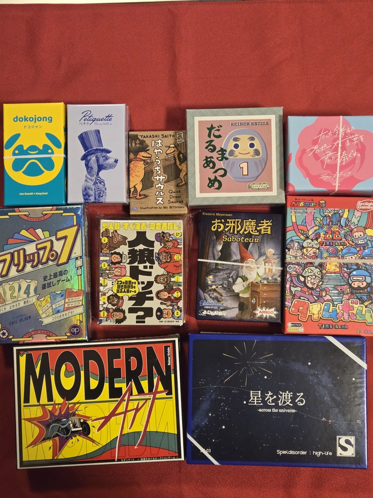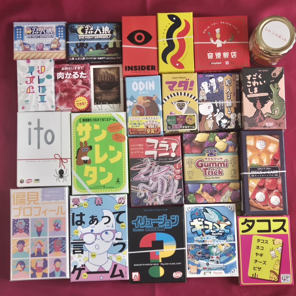 その他、音速飯店・シレット・ワンナイト人狼・人狼ドッチ・はやうちサウルス・マダ・ファイブタワーズ・迷子・オーディン・だるまあつめ・お邪魔者・フラフー・タコス・サンレンタン・フリップ7・クク21・偏見プロフィール・スカルキング・もっとホイップを・忍者バナナ・ヘルパゴス・マスカレイド・やぎ崖っぷち・インカの黄金・チーズは誰が食べた・パンダロイヤル・ストライク・まっぷたツートンソウル2・ブラフ などなど…