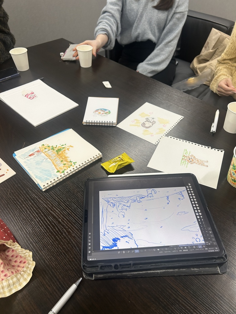 ・持参のiPadやスケッチブックに絵を描きながら雑談(メイン)