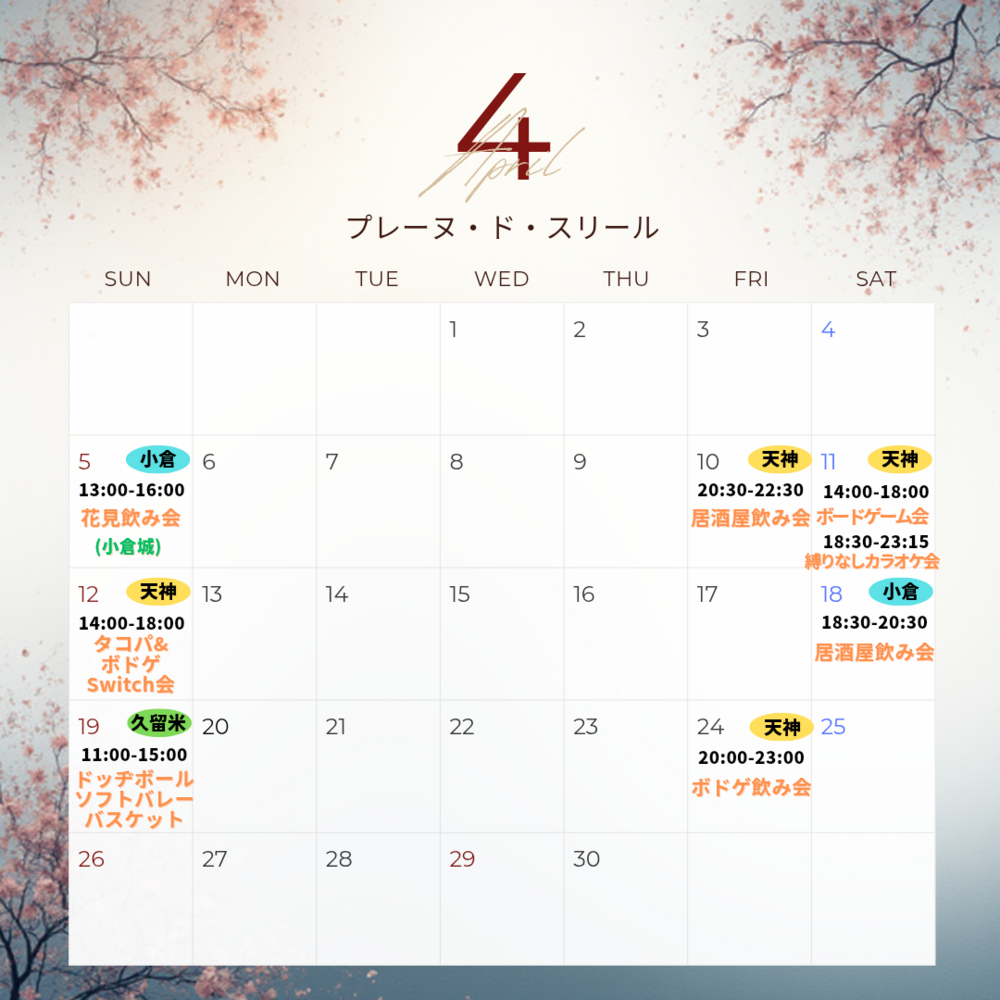 福岡で活動している友達作りサークル『Plein de sourires(プレーヌ・ド・スリール)』と申します!
