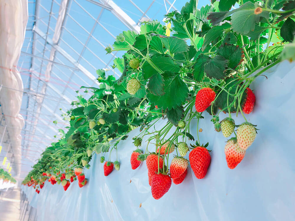 ハウスいっぱいに広がる真っ赤ないちご「紅ほっぺ」を、その場で摘んで、味わって、笑顔になるひととき🍓