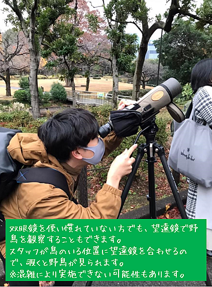 鳥の研究や調査経験者のスタッフが観察方法や鳥の生態について教えます。鳥の名前を知らなくても、バードウォッチング未経験者でもお気軽にご参加ください。
