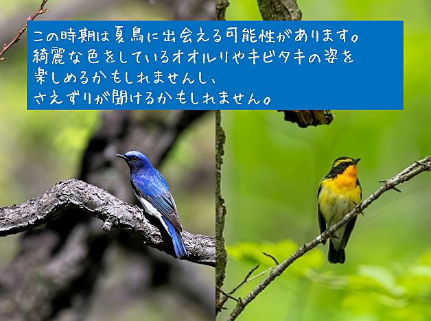 通常は90分〜120分程度の道のりを鳥を探しながらゆっくり歩き、13:00ごろ山頂に着いたら解散します。(時間は前後する可能性があります)
