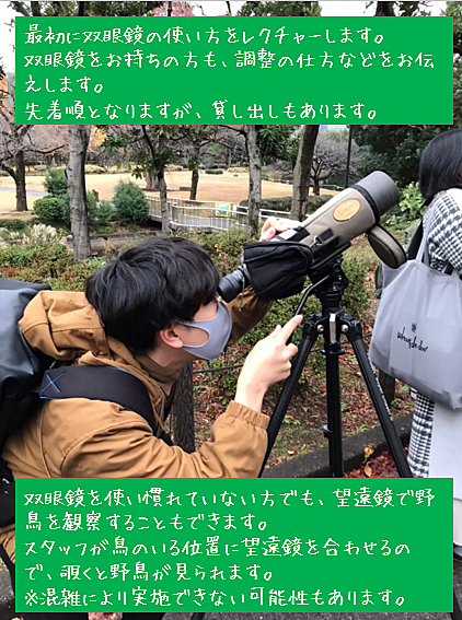 鳥の研究や調査経験者のスタッフが観察方法や鳥の生態について教えます。鳥の名前を知らなくても、バードウォッチング未経験者でもお気軽にご参加ください。