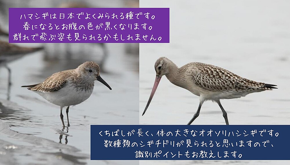 ・長靴orサンダルorスニーカー(長靴やサンダルはなくてもよいですが、干潟を歩くので、汚れてもよい靴でお願いします。長靴やサンダルのように濡れてもよいものだと、より近くで鳥を観察できます)
