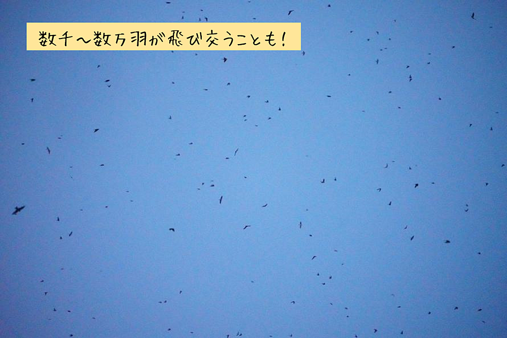 ねぐら入りをするツバメの数は7月頃から増え、多い時には数千~数万の大群が空を飛び交い、ねぐらに入ります。