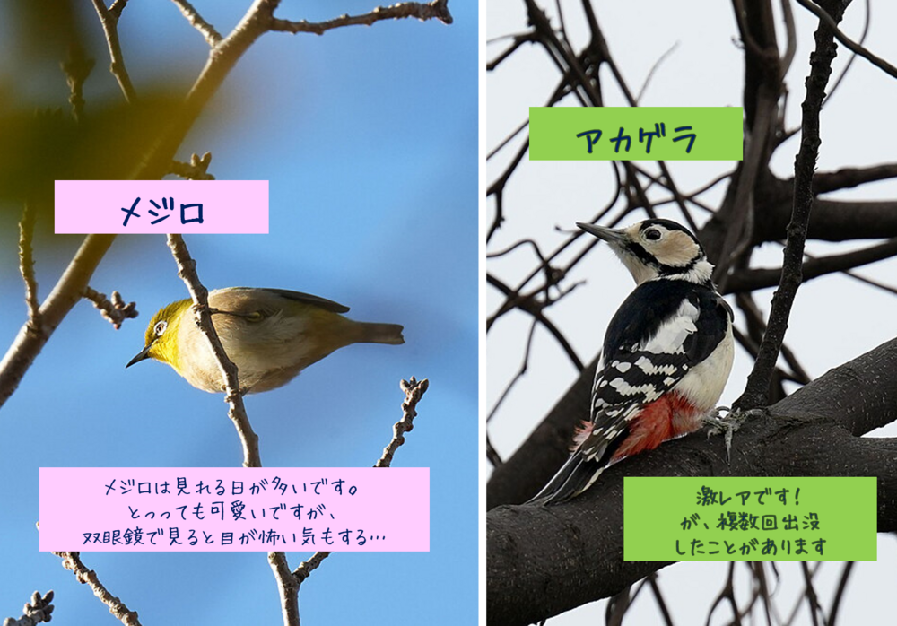 季節や条件によりますが、10-30種程度の鳥が観察できます。