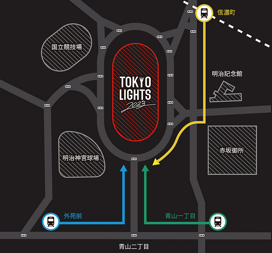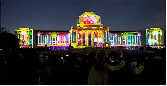 本イベントでは、有料エリアの「プロジェクションマッピング国際大会」ではなく、無料エリアの「光の祭典エリア」に参加します。少し離れますが「光の祭典エリア」からも聖徳記念絵画館へのプロジェクションマッピングを鑑賞することができます♪