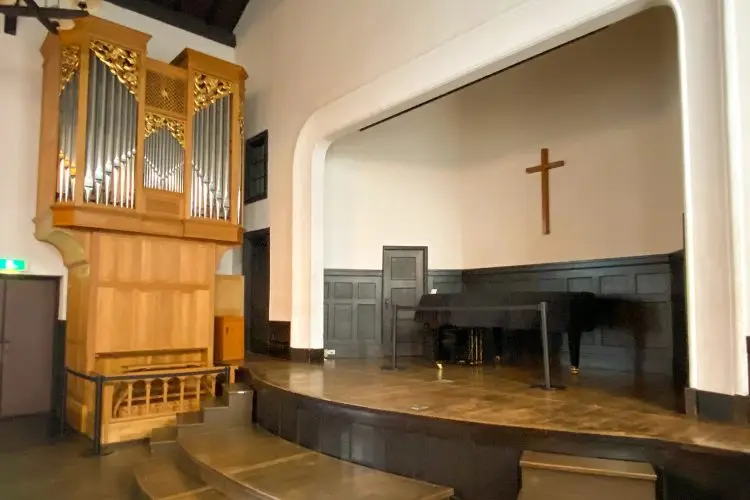 1921年に早稲田奉仕園のシンボルとして建設された東京都選定歴史的建造物であり、赤煉瓦造りの美しい外観と優れた音響を持つ講堂です。現在、日本基督教団 早稲田教会の礼拝堂として使用されており、内部にはスコットホール献堂100周年を記念して2019年にスイスのペーター・マイヤー社によって設置された本格的なパイプオルガンが備えられています。このオルガンは、礼拝における讃美歌の伴奏やコンサートなどで使用され、ホールの歴史的な空間に荘厳で豊かな響きを添え、早稲田の文化・信仰活動の拠点としての役割を支えています。