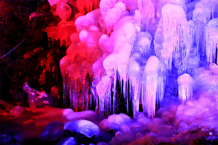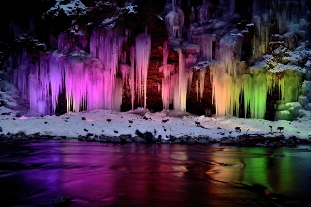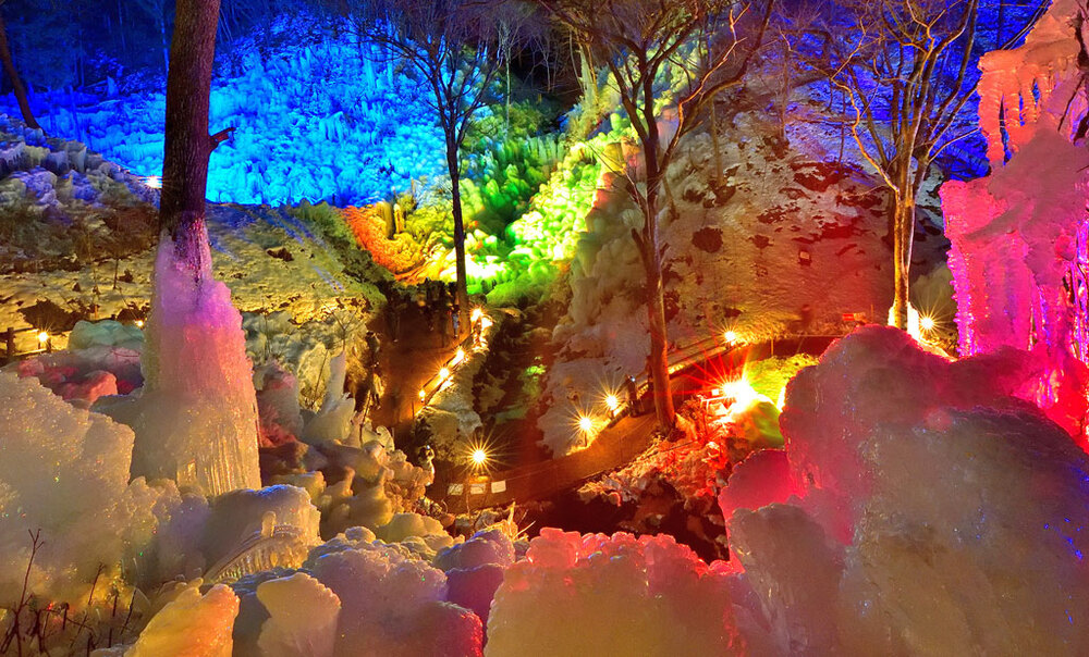 山肌のあちらこちらに氷の造形美、氷の華が咲きみだれるのが、あしがくぼの氷柱の特徴です⛄️ここは300m以上にわたって沢の水を撒いて作り上げた、人工の氷の芸術で、高さ約30m、幅約150mの大きな氷柱が山肌に現れ、毎週、金曜・土曜・日曜には日没から午後8時までライトアップが行われ、幻想的な世界が広がります🌎✨