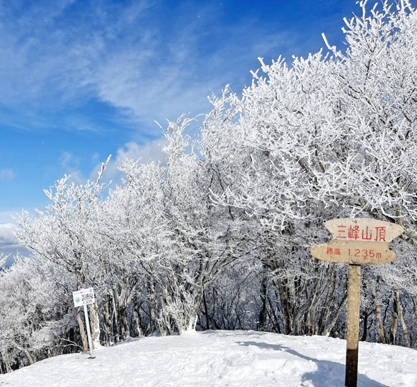 この時期の三峰山は木々に霧氷(氷点下の環境で、空気中の過冷却された水滴や水蒸気が樹木などの地物に付着して凍りつき、白く成長する現象)が育ち、雪の華を咲かせます❄️