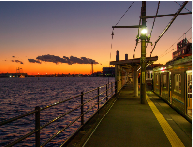 ⑧海芝駅 (京浜工業地帯の海が見える不思議な駅、日没に合わせて電車に乗りましょう)