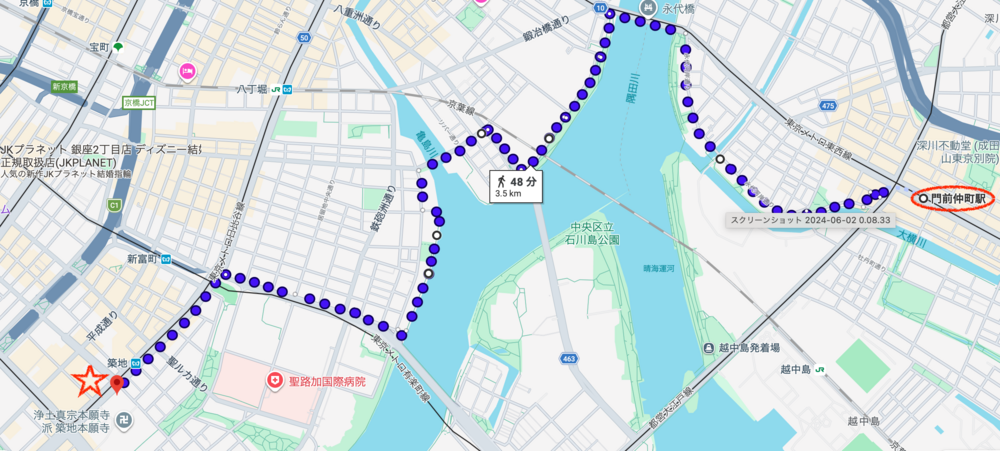 ②気持ちよくあさんぽしながら、築地本願寺を目指します。(画像のルートで歩く予定です。ただ、変更する可能性もありますのでご了承ください。)
