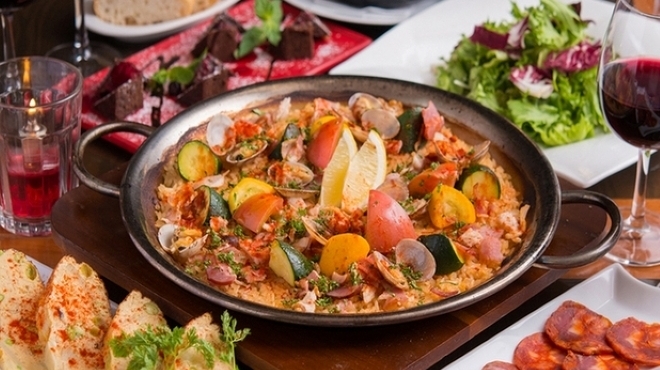 ◉【スパニッシュランチ全5品】人気のパエリアやアヒージョなど+スパークリング含む1ドリンク1,900円(税込)