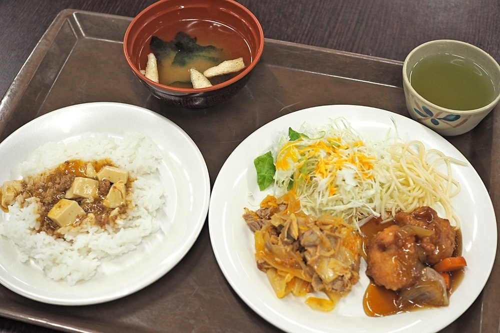 唐揚げはジューシーな揚げたて。豚キムチはしっかり味が染み渡り、辛さは定食全体のスパイスにもなっている。またライスには麻婆豆腐がトッピングされており、お得感もあります☺️