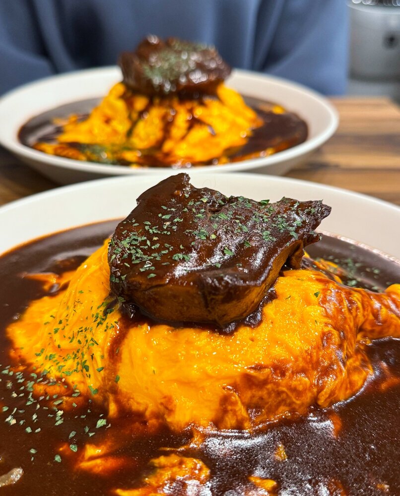 8時間じっくり煮込んだ牛タンは、トロトロに柔らかく、秘伝のスパイシーでコクのあるペッパーバターライス、50年の歴史を誇るデミグラスソース、茨城県産「奥久慈卵」の濃厚な香りとコクが絶妙に絡み、誰もが魅了される一品です。
