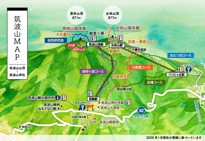 セブンイレブン東所沢駅前店→10:30筑波山観光案内所→ケーブルカー→男体山→ランチ→女体山→おたつコース→弁慶七戻り→つつじが丘駅→迎場コース→15:00頃下山→筑波山神社→車で移動→東所沢駅付近→解散
