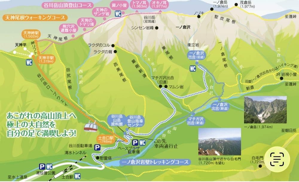 ・集合場所→車で移動→ロープウェイとリフトに乗車→天神峠から登山開始→トマの耳→オキの耳→天神平駅→谷川岳温泉湯吹の湯→集合した場所へ(解散)