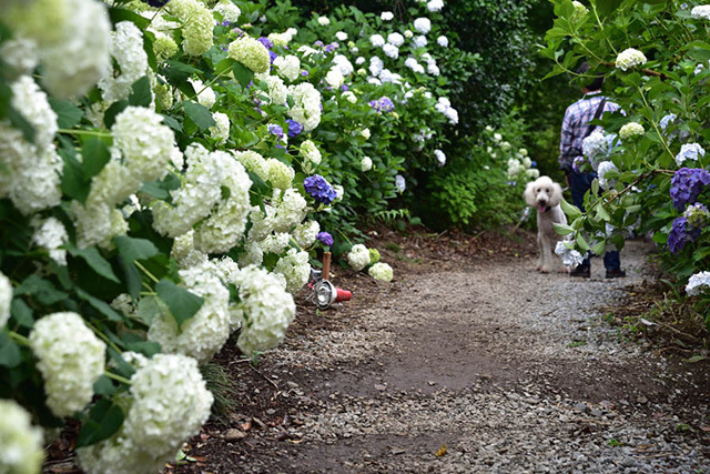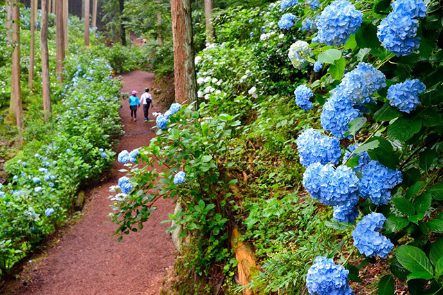 あじさいは50種類以上にもおよび、なかには国内でも見られる場所が少ない珍しい品種も。周囲を高い木々に囲まれ、6月から約1ヶ月間、青、紫、白などの色あざやかなあじさいが咲き乱れ、幻想的な雰囲気が漂います。