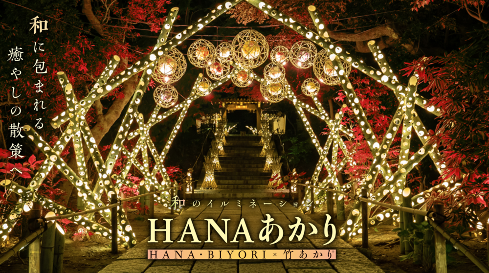 「HANA あかり」は竹オブジェにあかりを灯す竹あかりと、優美にライトアップされた樹木や花々・文化財により、園内が柔らかな光に包まれる和のイルミネーションイベント。2025年10月23日より新スポットが登場し、パワーアップして開催いたします。